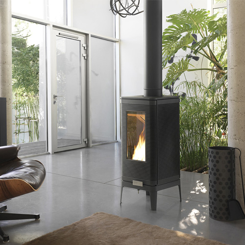 O sistema de vidro próprio permite diminuir a sujidade no vidro. Uma entrada de ar na parte superior do vidro cria um véu de proteção. O ar pré-aquecido é propulsionado ao longo do vidro. Provoca a ativação da combustão dos gases e as matérias voláteis protegem desta forma o vidro face ao fumo e ao depósito de fuligem.