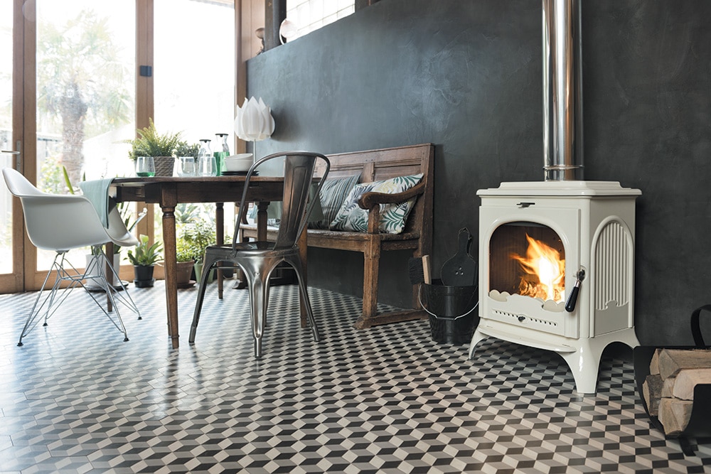O sistema de vidro próprio permite diminuir a sujidade no vidro. Uma entrada de ar na parte superior do vidro cria um véu de proteção. O ar pré-aquecido é propulsionado ao longo do vidro. Provoca a ativação da combustão dos gases e as matérias voláteis protegem desta forma o vidro face ao fumo e ao depósito de fuligem.